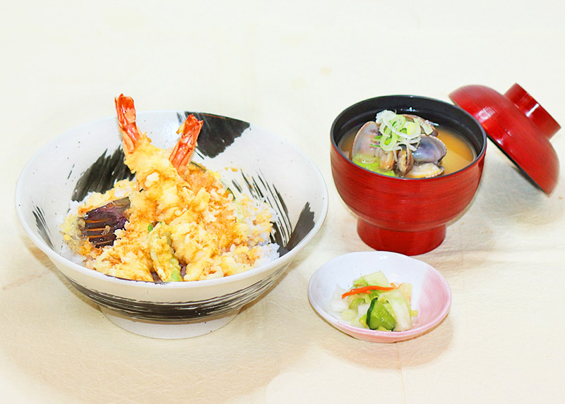 ●大エビ天丼みそ汁セット1500円(税込1650円)(天丼、みそ汁、つけもの)